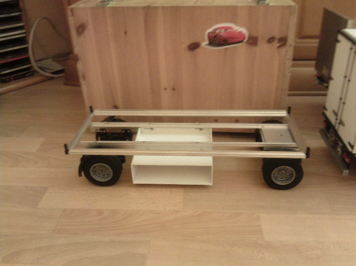 Hier mit fertiger Antriebs und Nachlaufachse (lenkbar) und Kofferaufbau